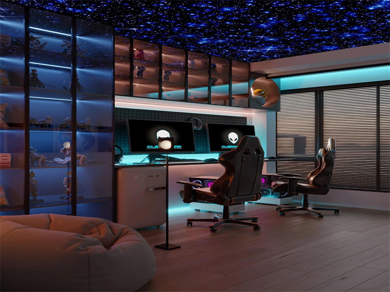 電競(jìng)房選擇智能家具與不規(guī)則的幾何線(xiàn)條層層鋪疊,未來(lái)感的線(xiàn)性燈光成為空間